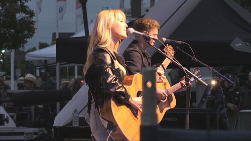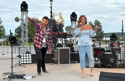 Troubadour Sept 6 Pure Country host Stan Musial and CTV News anchor Sarah Freemark on stage at the Troubadour Festival finale in downtown Barrie on Sat., Sept. 6, 2025.