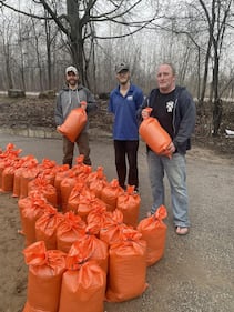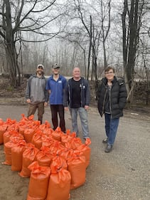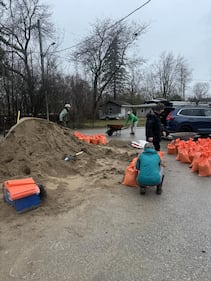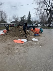 Flooding Dozens of sandbags are being filled by volunteers to help with the intense flooding in Orillia, Ont., on April 16, 2026. (Dave Frankum)