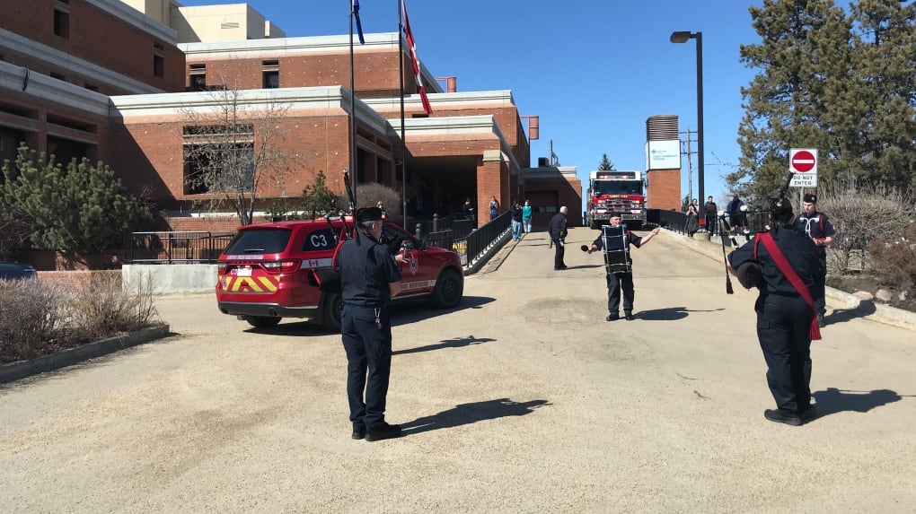 Leduc Fire Services Pipes and Drums hold musical performance outside community hospital