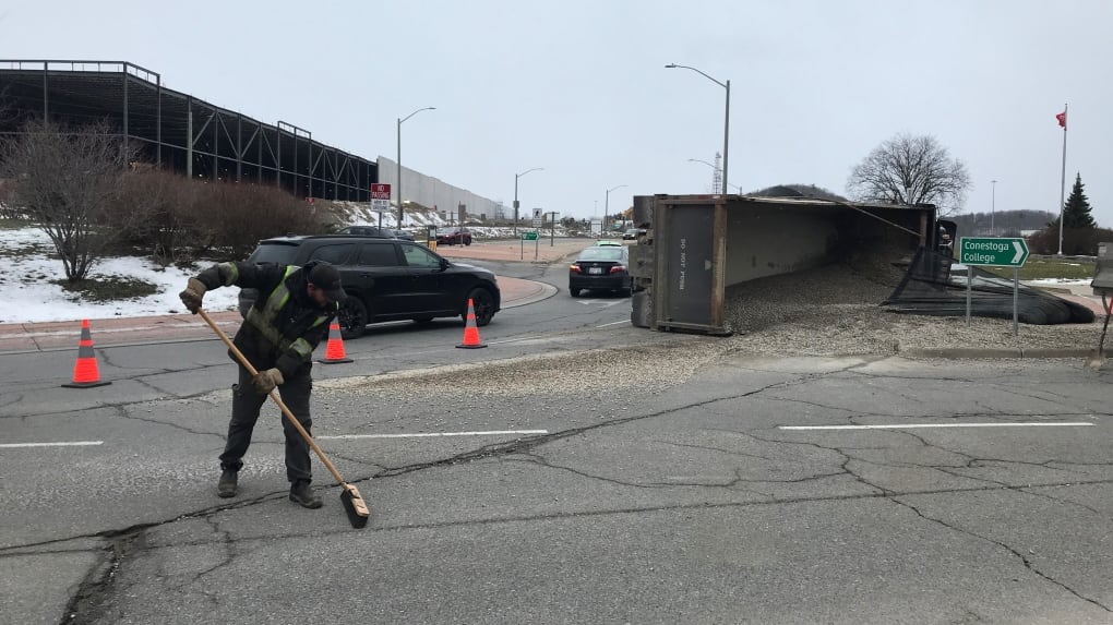 Dump truck spills load in Cambridge roundabout