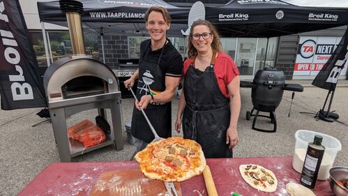 Will Aiello Emily Richards Will Aiello and Emily Richards make pizzas in an outdoor oven.