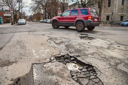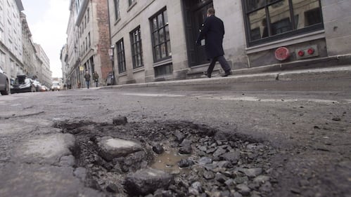 A pothole is seen on St. Paul street Friday, March 18, 2016 in Montreal. THE CANADIAN PRESS/Ryan Remiorz A pothole is seen on Saint-Paul Street Friday, March 18, 2016 in Montreal. (THE CANADIAN PRESS/Ryan Remiorz)