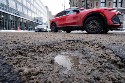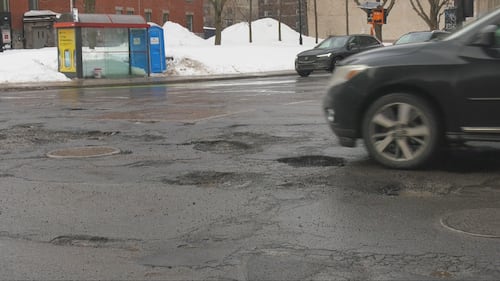 Nid de poule mtl A vehicle passes a pothole in downtown Montreal, Jan. 26, 2026.