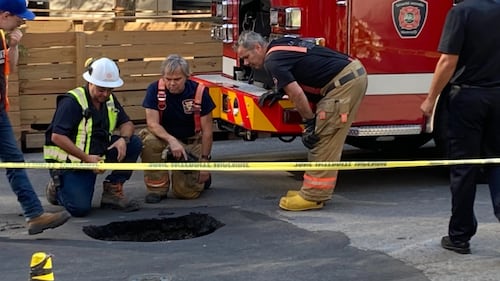 Firetruck in pothole Firefighters assess a hole that trapped a firetruck at a Montreal intersection on Wednesday, Aug. 2, 2023. (Max Harrold/CTV News)