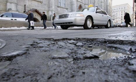 Potholes for Montreal Motorists steer past a pothole on a Montreal street on March 24, 2005. (Paul Chiasson / THE CANADIAN PRESS)