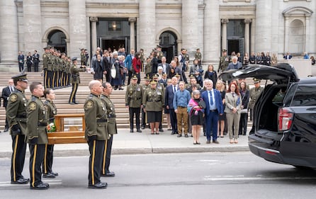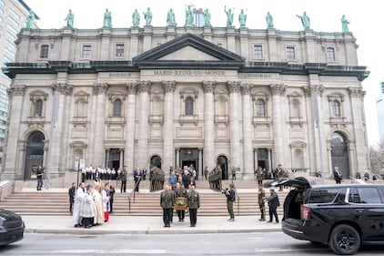 The parents and spouse of Surete du Quebec police Sgt. Anais Fortin-Cozzens, who died on duty in Northern Quebec watch as her urn is placed in a hearse at Mary Queen of the World Cathedral following her funeral in Montreal on Wednesday, April 29, 2026. THE CANADIAN PRESS/Christinne Muschi