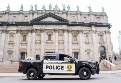 A police vehicle with flowers for Surete du Quebec police Sgt. Anais Fortin-Cozzens, who died on duty in Northern Quebec, waits outside Mary Queen of the World Cathedral during her funeral in Montreal on Wednesday, April 29, 2026. THE CANADIAN PRESS/Christinne Muschi