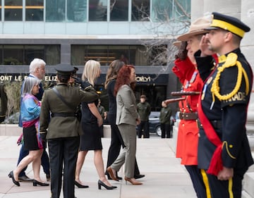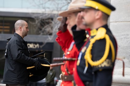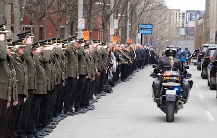 Surete du Quebec police officers stand at attention as the funeral procession for fellow officer Sgt. Anais Fortin-Cozzens, who died on duty in Northern Quebec leaves Mary Queen of the World Cathedral following her funeral in Montreal on Wednesday, April 29, 2026. THE CANADIAN PRESS/Christinne Muschi