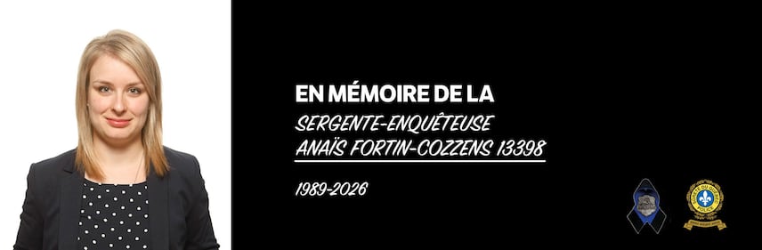 A banner on the Sûreté du Québec's website in memory of Sgt. Anaïs Fortin-Cozzens, who died March 31, 2026, in a crash in Portneuf-sur-Mer, Que. (Sûreté du Québec)
