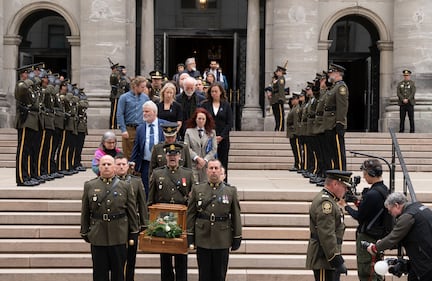 The urn of Surete du Quebec police Sgt. Anais Fortin-Cozzens, who died on duty in Northern Quebec is carried down the steps of Mary Queen of the World Cathedral followed by her family following her funeral in Montreal on Wednesday, April 29, 2026. THE CANADIAN PRESS/Christinne Muschi