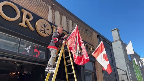 Senators Playoffs 2026 Canada flags being replaced with Senators flags outside the front entrance of Manor Lounge on Elgin Street's Sens Mile ahead of Game 1 of the NHL Playoffs on April 17, 2026. (CTV News Ottawa)