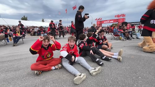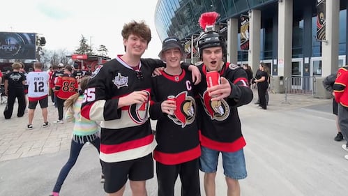 Senators Playoffs 2026 Sens fans at the CIBC Red Zone outside of Canadian Tire Centre during Game 1 of NHL Playoff hockey on April 18, 2026. (CTV News Ottawa)