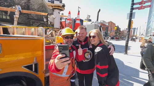 Senators Playoffs 2026 A city worker poses with Senators' alumni Chris Neil after posting the Sens Mile signage on Elgin St. in Ottawa on Friday, April 17, 2026. (CTV News Ottawa)