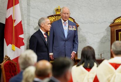 Royal Visit to Ottawa - Day 2 Prime Minister Mark Carney, left, and King Charles look on ahead of the King delivering the speech from the throne in the Senate in Ottawa on Tuesday, May 27, 2025. THE CANADIAN PRESS/Adrian Wyld
