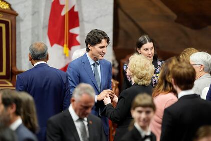 Trudeau at royal visit Former prime ministers Justin Trudeau, left, and Kim Campbell speak ahead of King Charles delivering the speech from the throne in the Senate in Ottawa on Tuesday, May 27, 2025. THE CANADIAN PRESS/Adrian Wyld
