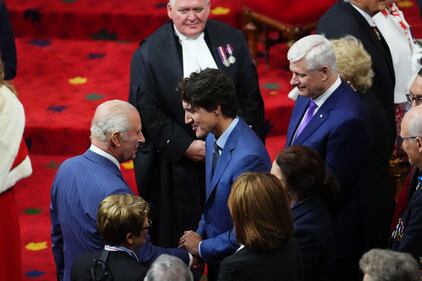 Royal Visit to Ottawa - Day 2 King Charles speaks with former prime minister Justin Trudeau ahead of the King delivering the speech from the throne in the Senate in Ottawa on Tuesday, May 27, 2025. THE CANADIAN PRESS/Sean Kilpatrick