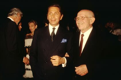 Italian fashion designer Valentino, whose real name is Valentino Garavani, and singer Roberto Murolo attend a party celebrating Valentino's 30-year career on May, 1991 in Rome, Italy. (Photo by Franco Origlia/Getty Images)
