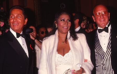 (L-R) Valentino Garavani, Aretha Franklin and Clive Davis attend "Valentino: Thirty Years of Magic" Gala Retrospective at the 67th Street Armory in New York City on September 22, 1992. (Photo by Ron Galella, Ltd./Ron Galella Collection via Getty Images)