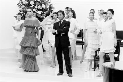 Designer Valentino Garavani takes a bow during the finale of the Valentino Spring 1990 Couture Collection Fashion Show. (Photo by Art Streiber/WWD/Penske Media via Getty Images)