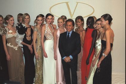Valentino with his models wearing the haute- couture spring/summer 2001 collection. (Photo by Stephane Cardinale/Sygma via Getty Images)