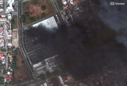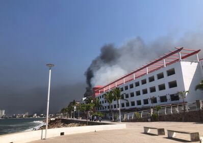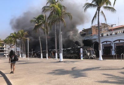 Smoke from car and bus fires beside the boardwalk in the tourist area of Puerto Vallarta, Mexico are shown in this image provided by Canadian Marc Edge. THE CANADIAN PRESS/Handout-Marc Edge