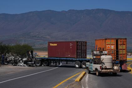 A burned truck blocks a highway leading to Tapalpa, Mexico, Monday, Feb. 23, 2026, a day after the Mexican army killed Jalisco New Generation Cartel leader Nemesio Oseguera Cervantes, known as "El Mencho."(AP Photo/Marco Ugarte)