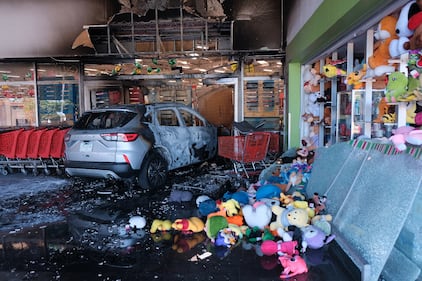 A charred vehicle sits at a damaged supermarket in Guadalajara, Jalisco state, Mexico, Sunday, Feb. 22, 2026, after the death of the leader of the Jalisco New Generation Cartel, Nemesio Rubén Oseguera Cervantes, known as "El Mencho." (AP Photo/Alejandra Leyva)