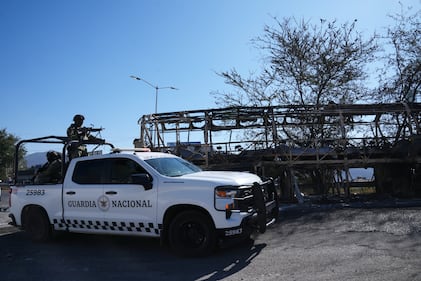 National Guard patrol past a charred vehicle the day after the Mexican army killed Jalisco New Generation Cartel leader Nemesio Oseguera Cervantes, known as "El Mencho," in Guadalajara, Mexico, Monday, Feb. 23, 2026. (AP Photo/Marco Ugarte)