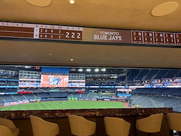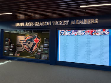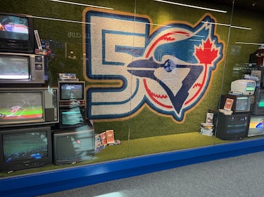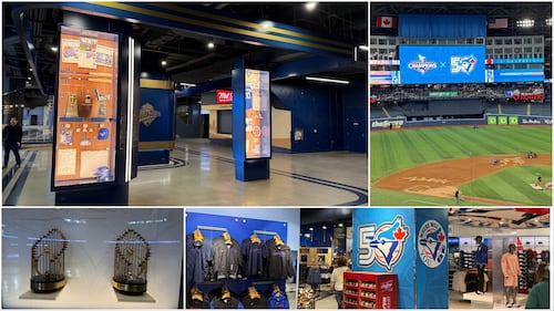 The screens loop highlights from the Blue Jays’ 1992 and 1993 World Series runs, including Joe Carter’s iconic walk-off home run.