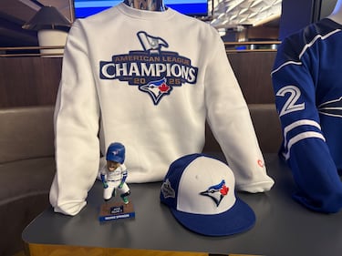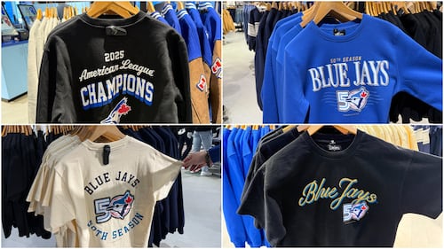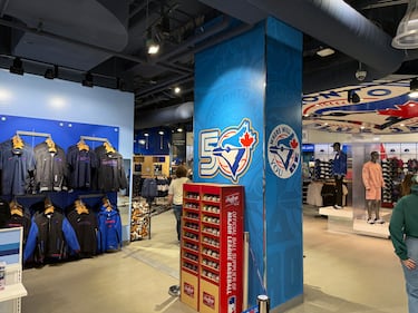 MERCHANDISE COLLECTION: Retail spaces throughout Rogers Centre are also stocked with new merchandise tied to the 50th anniversary season, including collaborations and retro designs. (Jermaine Wilson/CTV News Toronto).