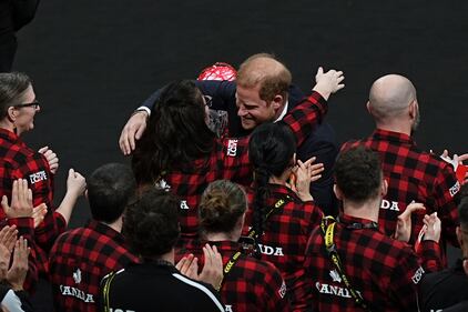 Invictus Games Prince Harry Prince Harry, the Duke of Sussex, embraces an athlete during the opening ceremony of the 2025 Invictus Games in Vancouver, Canada, Saturday, Feb. 8, 2025. (Aaron Chown/PA via AP)