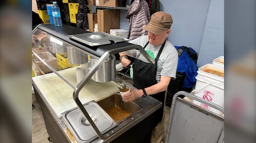 Agape Table A volunteer gives out a warm meal at Winnipeg, Man.'s Agape Table on March 30, 2026. (Ken Gabel/CTV News)