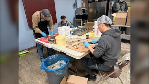 Agape Table A group of people help prepare meats at Agape Table in Winnipeg, Man., on March 30, 2026. (Ken Gabel/CTV News)