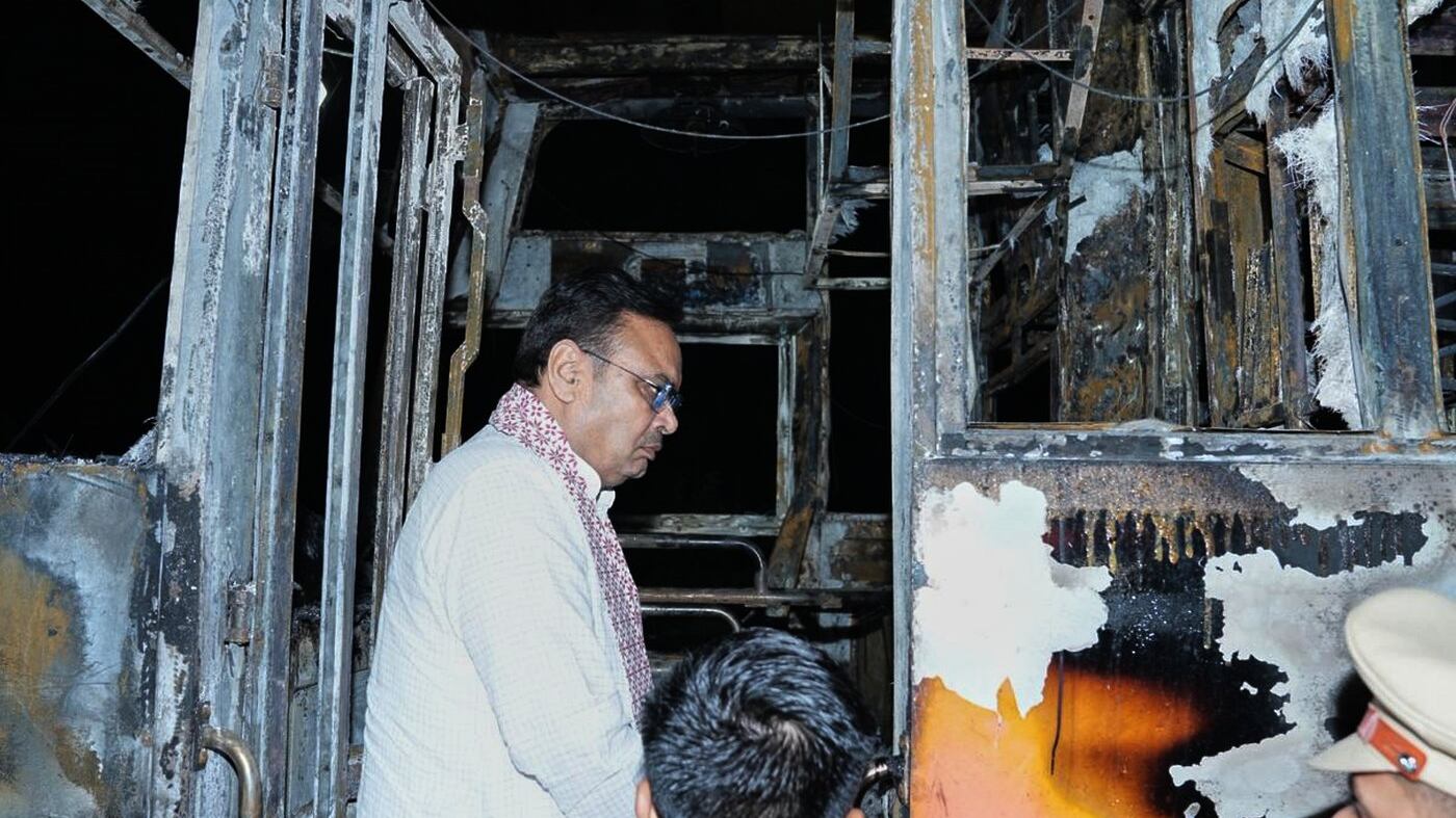 A passenger bus in northern India catches fire and burns at least 20 people to death
