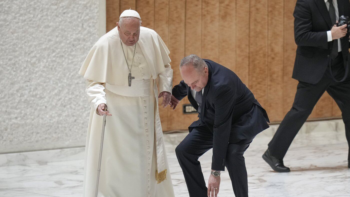 Pope Francis stumbles while walking into Jubilee audience at the Vatican as his walking stick snaps